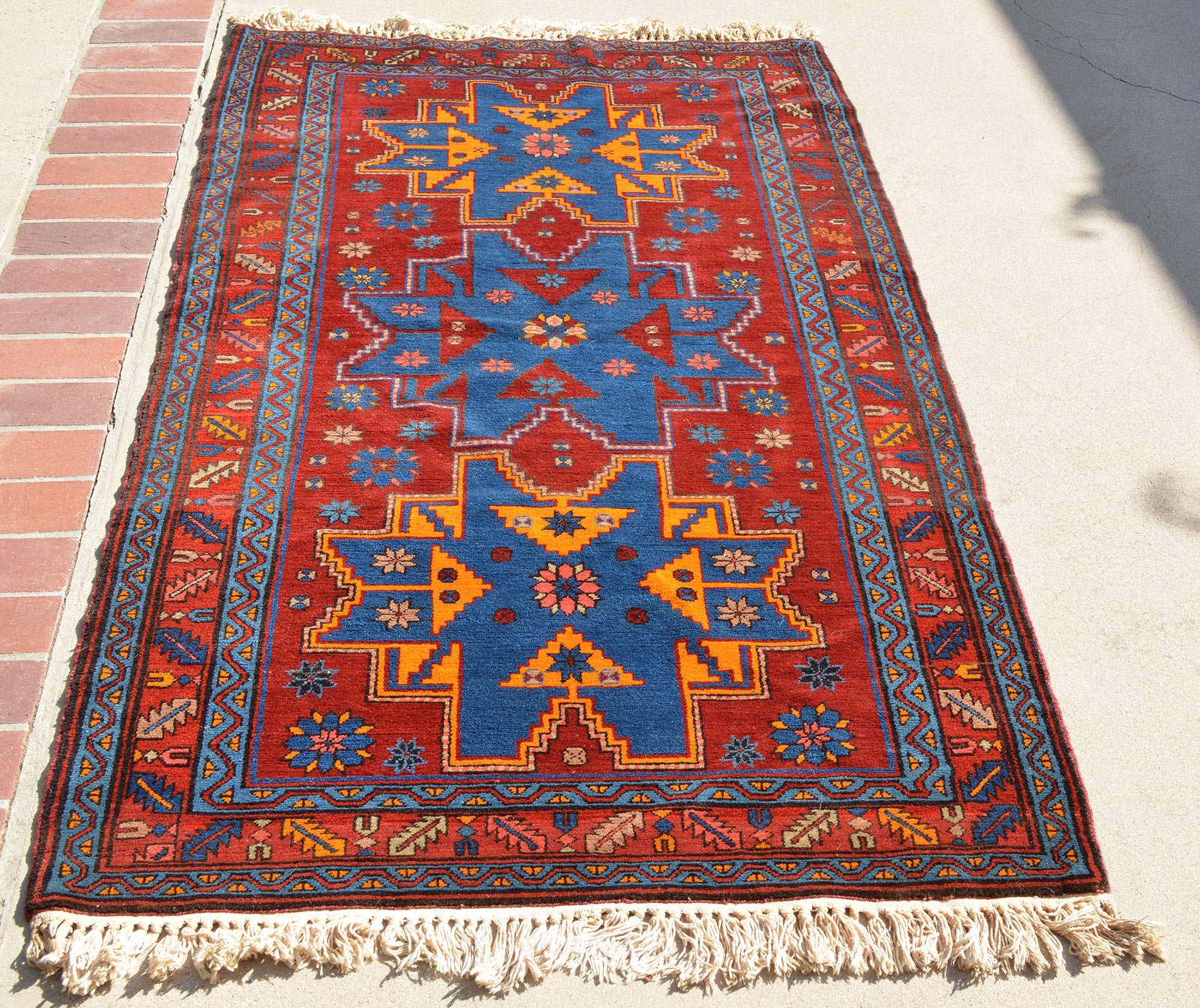 Handwoven Caucasian rug from Soviet Armenia. Purple, blue and orange bold colors.