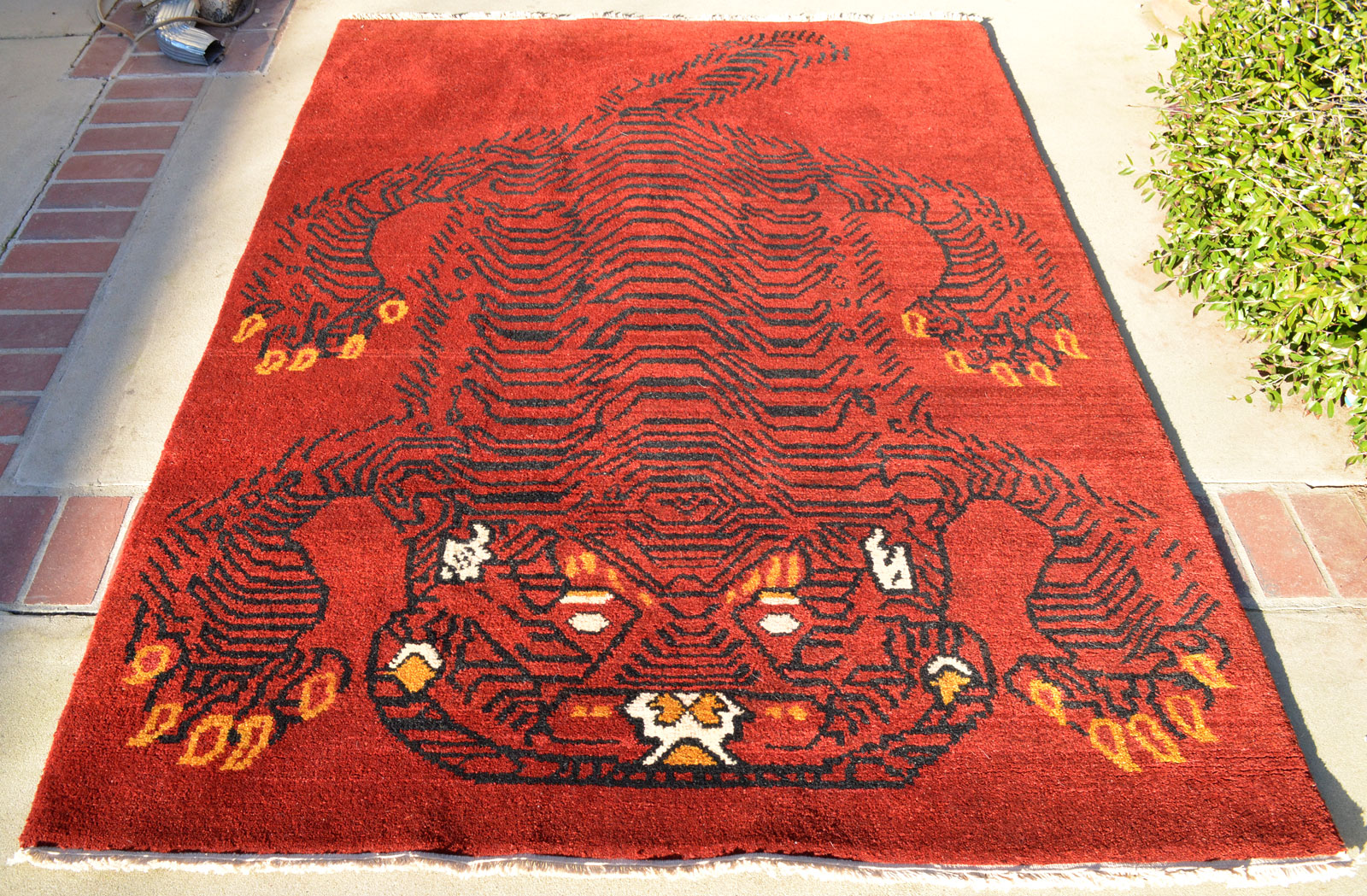 Wonderful handwoven tiger rug on a burgundy field. Inspired by traditional tiger rugs of Tibet.