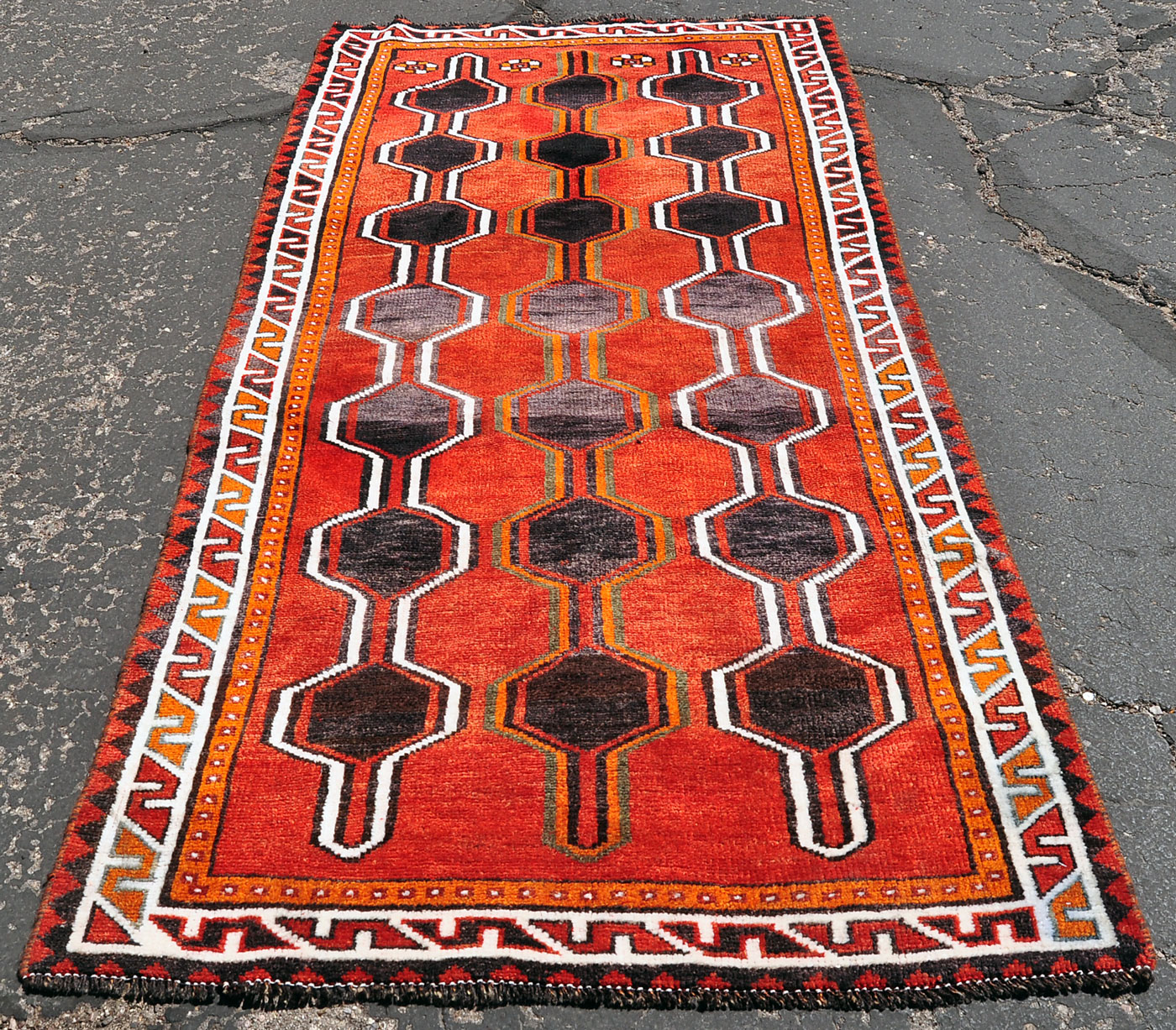 This geometric motif is most common around the city of Shiraz and is typically woven by tribal groups such as the Qashqai and Khamseh Federation.